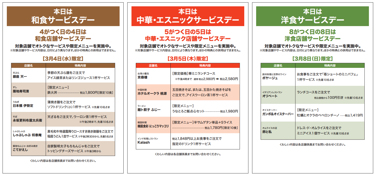 10階=レストラン街ダイニングパークでは、毎月4、5、8のつく日に、和食、洋食、中華・エスニックの対象店舗でオトクなサービスや限定メニューをご用意しております。