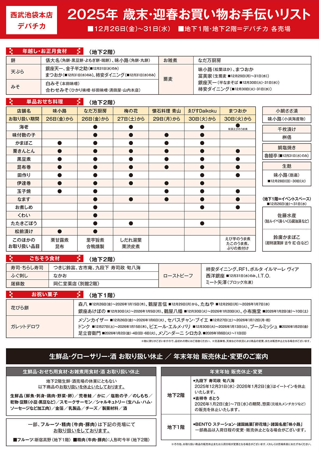 デパチカにて、年末年始に販売を休止または入荷日程を変更する売場をご案内いたします。