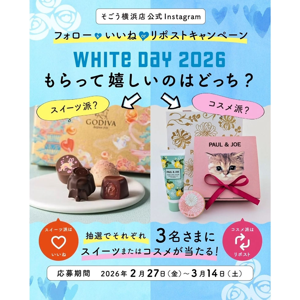 会期中、そごう横浜店公式Instagramをフォローのうえ、当キャンペーンポストをいいねまたはリポストをしていただいた方の中から抽選で合計6名さま(スイーツを選んでいただいた方の中から3名さま、コスメを選んでいただいた方の中から3名さま)にスイーツまたはコスメをプレゼントいたします。