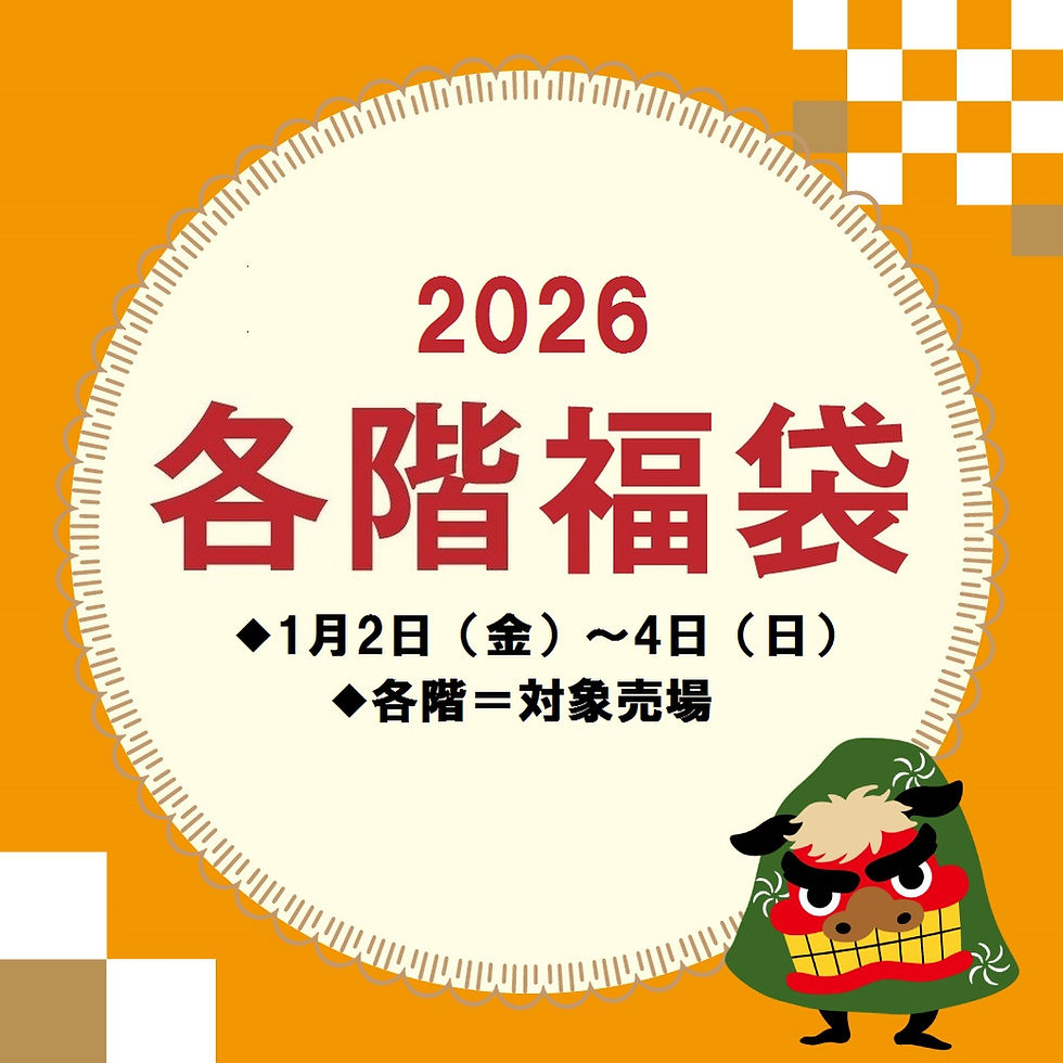 ★8階 催会場にて開催 〈婦人・紳士・こども〉新春福袋&ファッションバーゲン ■2026年1月2日(金)~6日(火) ■8階=催会場 ※午後7時閉場。 ※最終日は午後5時閉場。 話題の流行語福袋をご用意いたしました。 |
